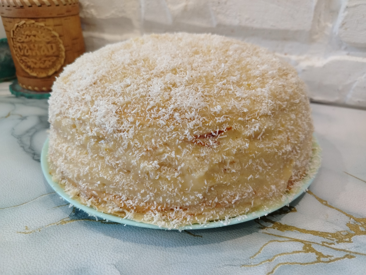 🥚Яйца — 3 шт. 🥚Молоко — 3 стакана. 🥚Мука — 300 г. 🥚Сахар — 2 ст. л. 🥚Соль — 1,5 чайные ложки. 🥚Разрыхлитель — 1 чайная ложка. 🥚Растительное масло — 3 столовые ложки. 🍋Яйца — 2 штуки. 🍋Сахар — 0,5–1 стакан (по вкусу). 🍋Мука — 1 столовая ложка (с горкой). 🍋Ванилин 🍋Молоко — 400 мл. 🍋Сок половины лимона 🍋Цедра 1 лимона. Готовим крем: Собираем торт следующим образом: блинчик — крем — блинчик — крем и т.д. Украшаем торт по своему вкусу. Я обмазала торт со всех сторон кремом и посыпала кокосовой стружкой. Готовый торт убераем в холодильник на несколько часов. Приятного аппетита!