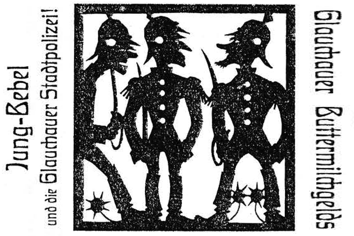 Город Глаухау в Саксонии, расположенный примерно в 60 километрах к югу от Лейпцига и в 25 километрах к западу от Хемница, хорошо знаком любителям нотгельдов: в 1922 году было выпущено не менее шести различных наборов "серийников" (хотя два из них без указания даты) и по крайней мере несколько таких серий можно найти даже в самых скромных коллекциях. Один из таких комплектов, в шесть бон, выдержанных в стиле "силуэтных изображений" и номиналом в пол-марки, рассказывает историю "молодого Бебеля и городской полиции Глаухау". Август Бебель (1840-1913) родился в Дойце близ Кёльна, и в молодости он выучился на токаря, получил должность столяра, а затем и мастера. Но нашёл он себя всё же на ниве просветительства, саморазвиваясь, ставши потом политиком. Бебель был соучредителем, вместе с Вильгельмом Либкнехтом (отцом Карла Либкнехта) в Германии Социал-Демократической Рабочей Партии (современной немецкой партии СДПГ). С 1871 по 1881 год он был членом "рейхстага", немецкого парламента, и ярым пр