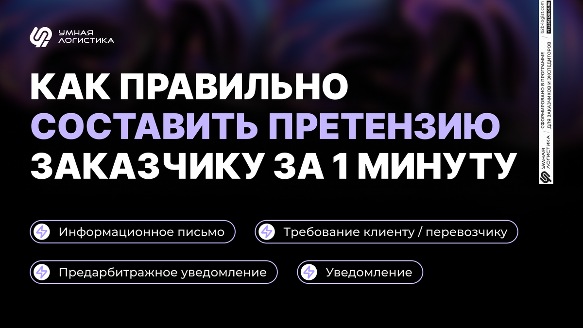 Открываем секрет: претензию реально составить без юриста и за 1 минуту. Рассказываем, как не тратить время и деньги на то, чтобы составить грамотную претензию, требование или предарбитражное уведомление заказчику. Когда нет единой системы, поиск нужных документов превращается в квест. Все разбросано по файлам и чатам — на сбор информации уходит больше времени, чем на возврат денег. Что больше всего вытягивает ресурсы: В Умной Логистике претензионная работа встроена прямо в систему. За пару кликов можно создать и отправить документ без ошибок и ожиданий юриста. Все в одном окне: от списка документов до печати файлов. 1. Претензия формируется автоматически Документ формируется по готовому юридическому шаблону. Данные подтягиваются автоматически — остается проверить и подтвердить. 2. Нужные файлы уже под рукой Программа сама подсказывает, какие заявки прикрепить. Не нужно искать их вручную или собирать по переписке. 3. Отправка и контроль документов в одном месте Документ можно распечатат