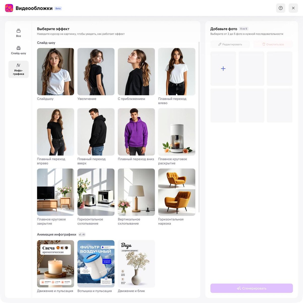 ⚡️ Генерация занимает до 1 минуты, а выбрать можно из множества эффектов — от плавных переходов до движения и пульсации.