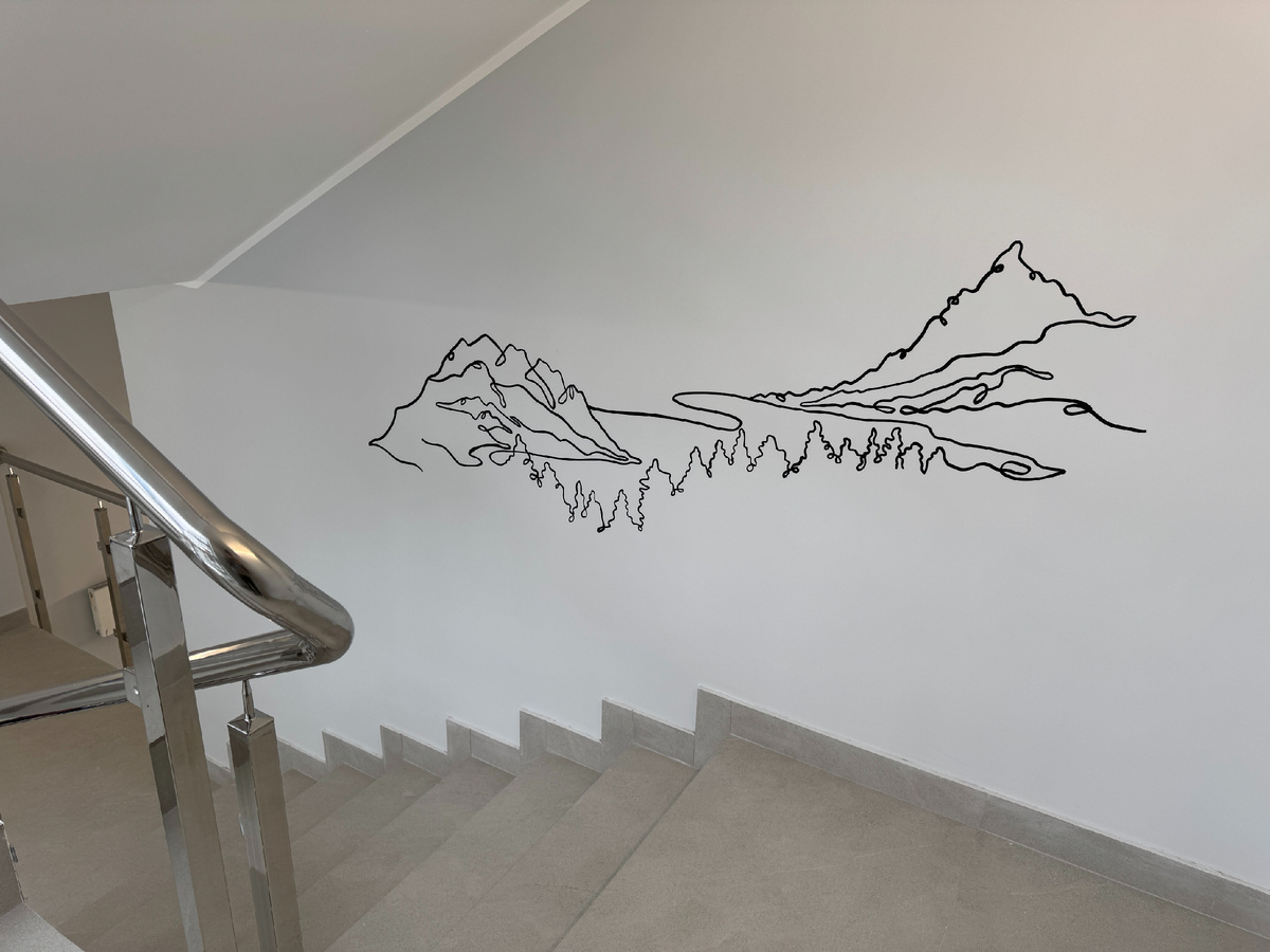 На первом этаже пациенты видят контурный рисунок одной линией — они у подножия горы. Минималистичный, но выразительный пейзаж создает ощущение начала пути.