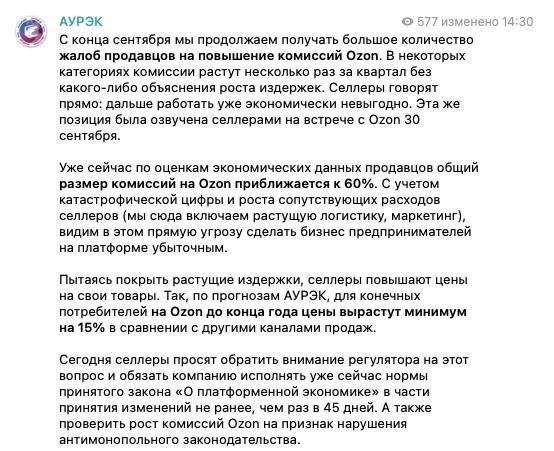 Комиссии Ozon приближаются к 60% Ассоциация электронной торговли (АУРЭК) заявила, что с конца сентября получает вал жалоб от продавцов: комиссии на Ozon продолжают расти — в некоторых категориях несколько раз за квартал, без объяснения причин. Селлеры прямо говорят: работать становится экономически невыгодно. По оценкам АУРЭК, с учётом логистики, продвижения и прочих расходов, реальная нагрузка на продавца уже приближается к 60%. Пытаясь компенсировать издержки, селлеры вынуждены повышать цены. До конца года, по прогнозам ассоциации, цены на Ozon вырастут минимум на 15% относительно других каналов продаж. Ассоциация призывает регулятора обратить внимание на ситуацию и обязать Ozon соблюдать закон «О платформенной экономике» — изменения условий не чаще, чем раз в 45 дней, — а также проверить рост комиссий на признаки злоупотребления доминирующим положением. 60% — это уже не комиссия, а партнёрство в одностороннем порядке. Marketplace_biz - отдай свой буст каналу