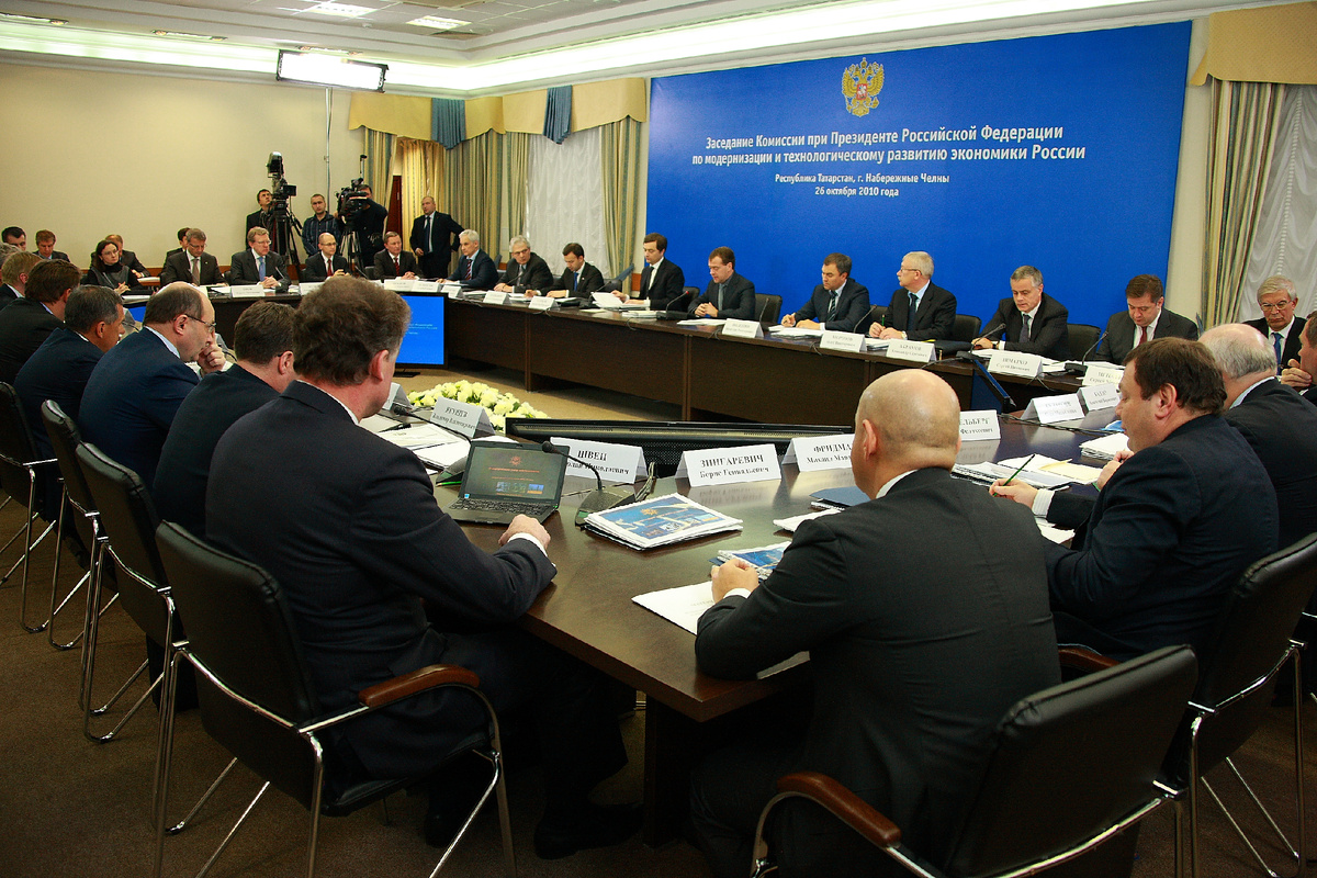 26 октября 2010 года в здании генеральной дирекции Медведев Д.А. – президент РФ провёл заседание Комиссии по модернизации и технологическому развитию экономики России. Предлагаю вам посмотреть фотографии с этого собрания. После заседания Медведев Д.А. посетил научно-технический центр КАМАЗа, где осмотрел образцы новой гражданской и военной техники, созданной за последние годы специалистами предприятия. Известно также, что 15 лет назад Президент РФ объявил о присвоении Когогину С.А. - генеральному директору КАМАЗа почётного звания «Заслуженный работник транспорта Российской Федерации» за заслуги в развитии отечественного автомобилестроения и многолетнюю добросовестную работу. Стоит заметить, что второй раз Медведев Д.А. приезжал на КАМАЗ уже в качестве председателя правительства РФ 2 декабря 2014 года, когда камский автозавод отмечал 45-летие с начала строительства КАМАЗа.