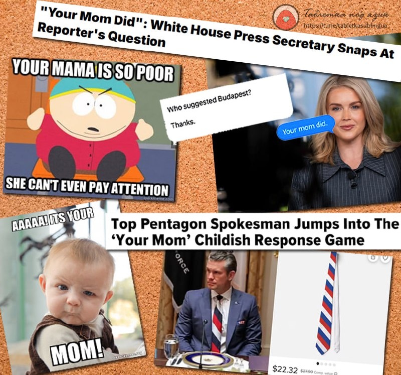 От репертуара школьников и MTV 90-х до официальной риторики Белого дома. На днях Кэролайн Левитт (пресс-секретарь Белого Дома) ответила журналисту HuffPost на вопрос, кто выбрал Будапешт местом встречи Трампа с Путиным: "Your mom did" ("Твоя мама выбрала"). Там было ещё много интересного, но сегодня сосредоточимся на этом выражении.