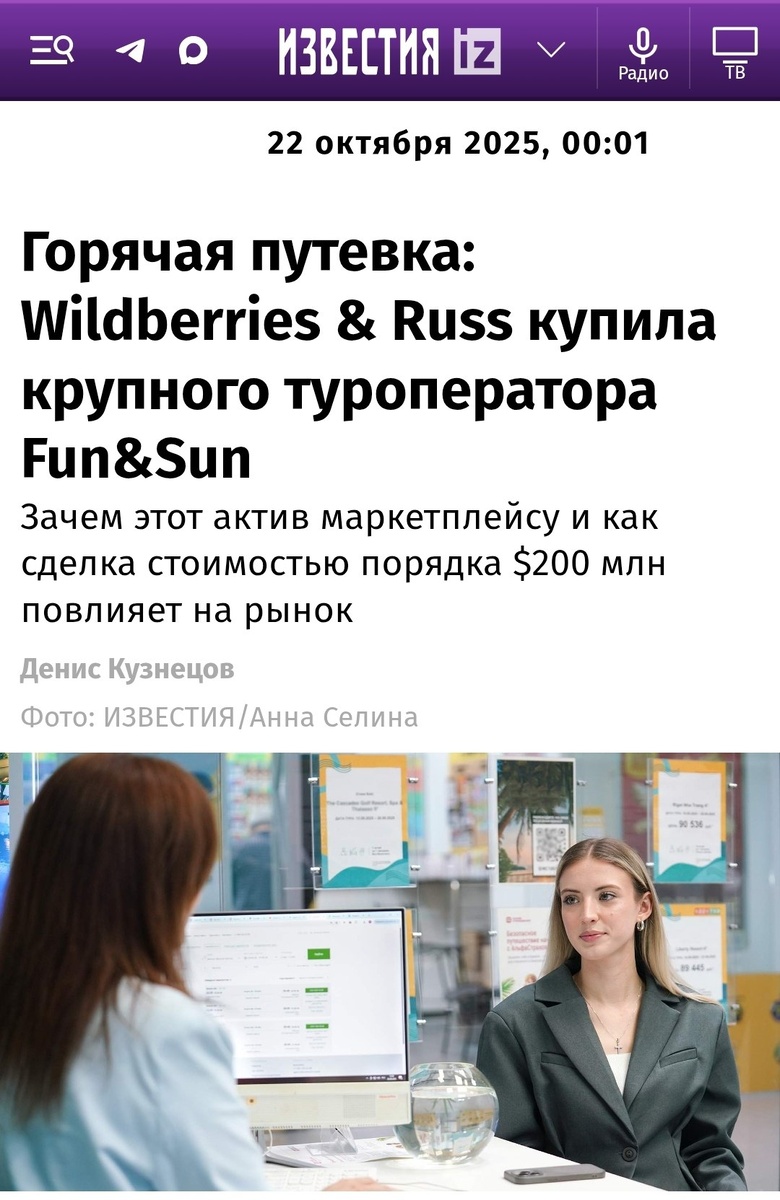 ⚡Wildberries купила крупного туроператора за $200 млн, у компании 12 тыс