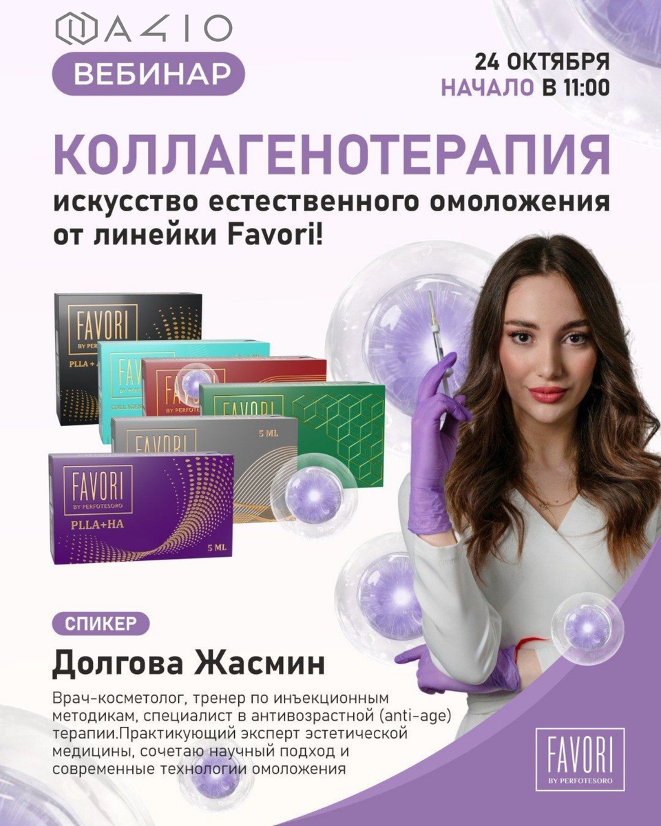 🔥БЕСПЛАТНЫЙ ВЕБИНАР FAVORI🔥 📘Тема: «КОЛЛАГЕНОТЕРАПИЯ - искусство естественного омоложения ✨ от линейки Favori» 🗓️Дата: 24 ОКТЯБРЯ 🕗Время в 11:00 🎤Спикер: Долгова Жасмин — Врач-косметолог 👩⚕️, тренер по инъекционным методикам, практикующий эксперт, сочетающий научный подход 🔬 и современные технологии омоложения. Программа: 👇 - Коллагенотерапия 360° 🔄 с Favori Colloprime и Collagen SuperLift! - "Коллаген от А до Я" 📚 и главные тренды эстетической медицины 2025. 🚀 - Favori PLLA+HA и PLLA+Activator — биостимуляторы нового поколения. 🌱 - Favori PROZINK "Жидкие бионити": как цинк 🧪 усиливает плотность дермы. 💪 - Эффективные протоколы ✅ и впечатляющие клинические результаты! ✨ Регистрация на вебинар по ссылке: https://clck.ru/3Pq98K *Информация предназначена только для работников здравоохранения ❗Скачивайте приложение A410 и записывайтесь на мероприятия за один клик: iOS → https://clck.ru/3PaaQ2 Android → https://clck.ru/3PabuT