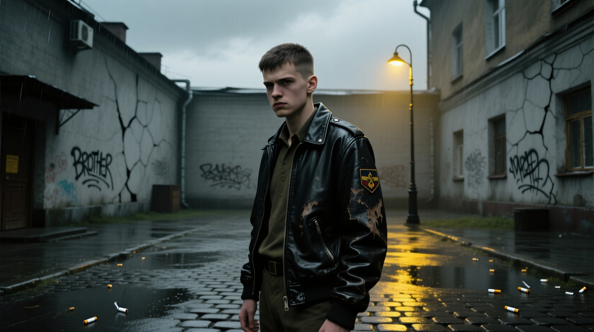 Молодой мужчина в чёрной кожаной куртке, короткая стрижка, пристальный взгляд, фон — серый ленинградский двор с мокрым асфальтом, стиль — российское кино 1990-х, «Брат» (1997), контровое освещение от фонаря, низкий ракурс, 35 мм, зернистость плёнки, настроение — меланхолия и внутренняя сила.