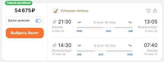 ✈️Москва - Йоханнесбург (ЮАР), туда и обратно с пересадками в Аддис-Абеба за 54700 рублей, багаж включён