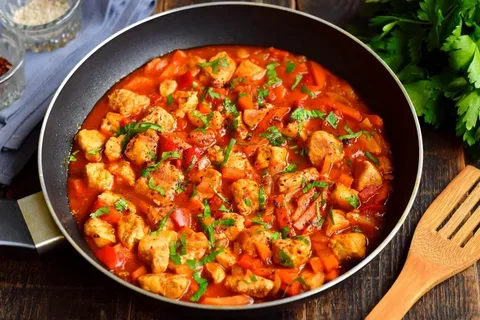 СВИНИНА,ТУШЕННАЯ СО СЛАДКИМ ПЕРЦЕМ И МОРКОВЬЮ В ТОМАТНОМ СОУСЕ