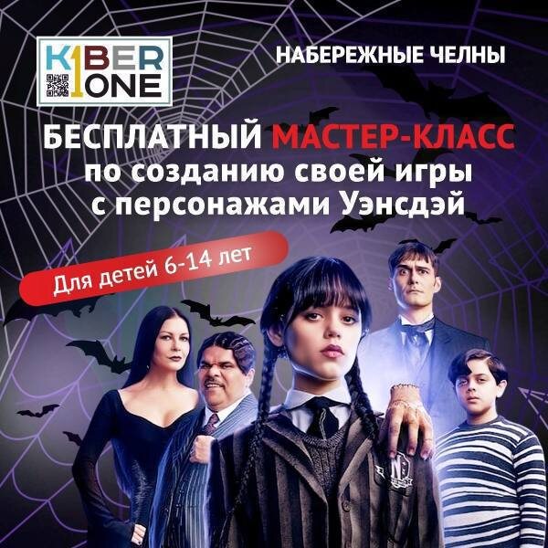 🎃 На этой неделе приглашаем ребят 6-14 лет из Набережных Челнов на бесплатный мастер-класс по созданию своей мобильной игры с персонажами Уэнсдэй!