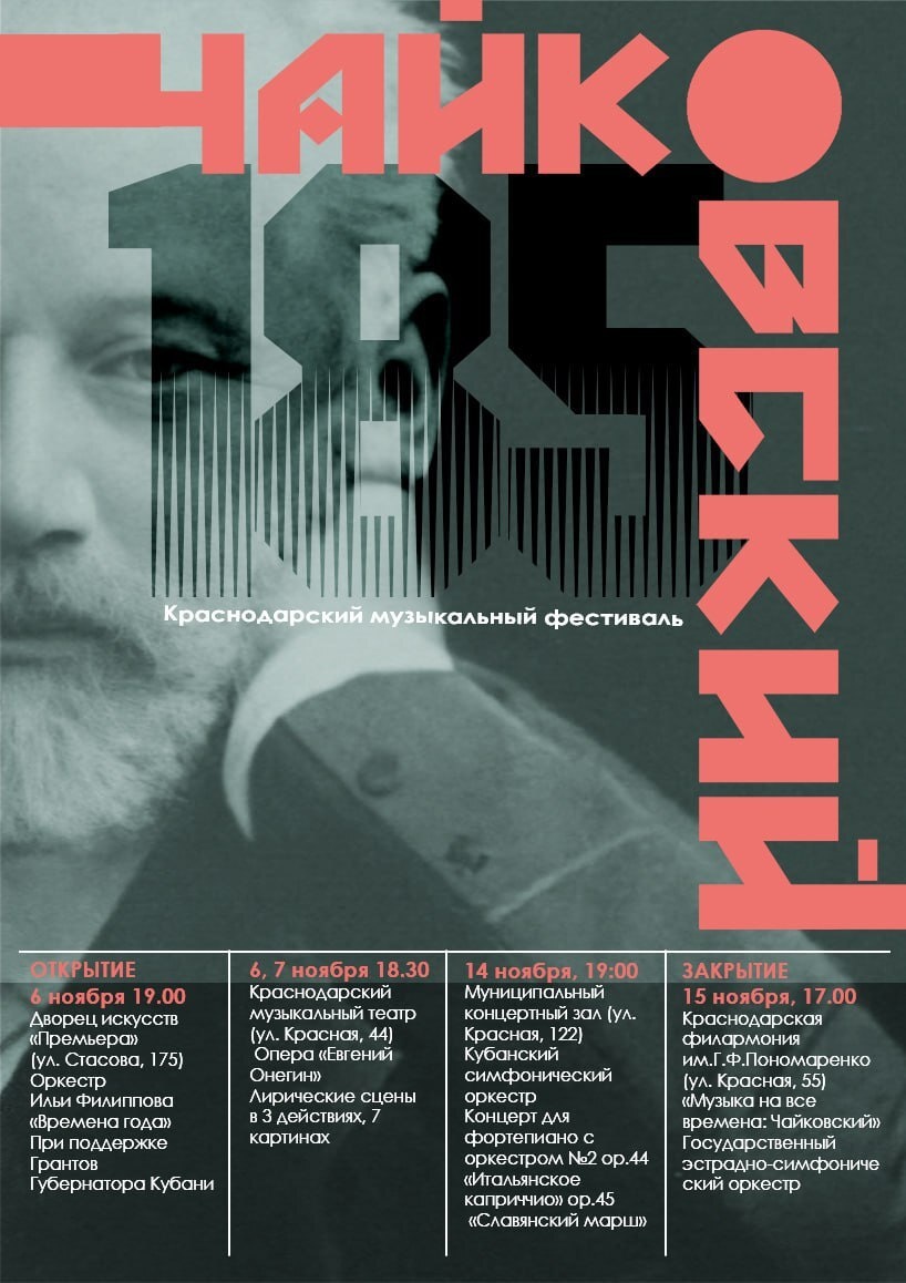 В Краснодаре стартует музыкальный фестиваль «Чайковский — 185», посвященный юбилею композитора. Этот фестиваль — особенная возможность прикоснуться к творчеству одного из величайших композиторов всех времён. Открытие фестиваля состоится 6 ноября на сцене дворца искусств «Премьера». В рамках фестиваля концерты пройдут также в Музыкальном театре и Муниципальном концертном зале.