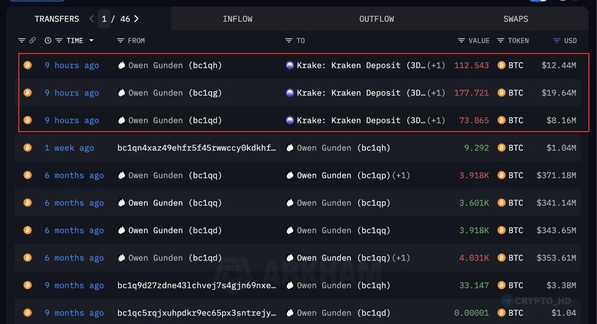 🫡 Древний холдер BTC (из 2013 года) Owen Gunden начал продавать свои запасы монет на бирже Kraken! - Arkham