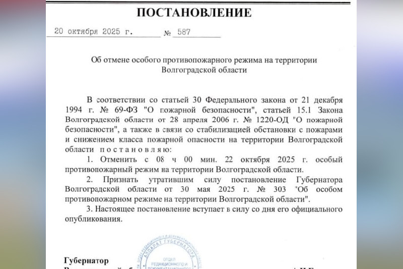 Сегодня, 22 октября, в Волгоградской области снят особый противопожарный режим, который был установлен в регионе 20 марта текущего года. Документ подписал губернатор региона Андрей Бочаров. Решение о введении особого противопожарного режима было принято для защиты граждан и имущества от возможных пожаров, для предотвращения угрозы инфраструктуре и недопущения развития неблагоприятных ситуаций в лесах. Последние годы показали: только наступление того периода осени, который характеризуется дождливым периодом, в регионе становится безопаснее в пожарном отношении на открытом воздухе. Добавим, что пожароопасный период (не особый противопожарный режим) сохраняется.