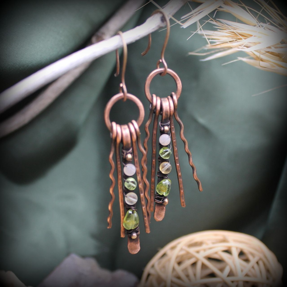 Медные серьги-палочки с подвесками. Прокованные полоски меди, покрытые патиной. Камни - хризолит неправильной формы и с огранкой, цитрин и солнечный камень.