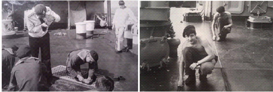 Смотровая площадка на корабле. Егоров, ромашко, агапов, денисов зайцев, морозов, михальченко, мирошниченко и вормещер. Вахтенный привязывает флаг для захода к стенке. Стенкой назывался причал. Сход на стенку был только с разрешения старшего помощника капитана.