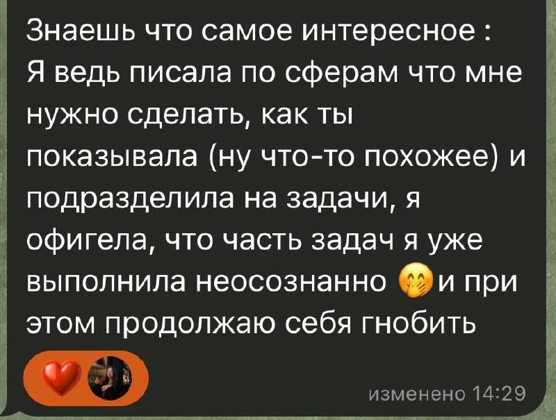 самобичевание никак не связано с реальностью. 🐓насколько бы ты ни был хорош, все равно найдешь за что кинуть в себя тухлый помидор. для себя я выбрала принять это как мой драйвер. типа топлива для движения вперед. потому что пока я на себя натягивала роль принимающей, как сову на глобус, я начала деградировать. а так, мое вечное недовольство двигает меня на улучшение меня же. ну и двигает людей вокруг 🚨 нужно было просто перестать об это разрушаться. перестать пытаться избавиться. это делается через позволение. опять же, в тему естественности. 👩 кстати, тема достижения целей разобрана в мини-курсе ➡️ ЖМИ СЮДА. это в тему того, как быть эффективным и продуктивным, не поехав кукухой.
