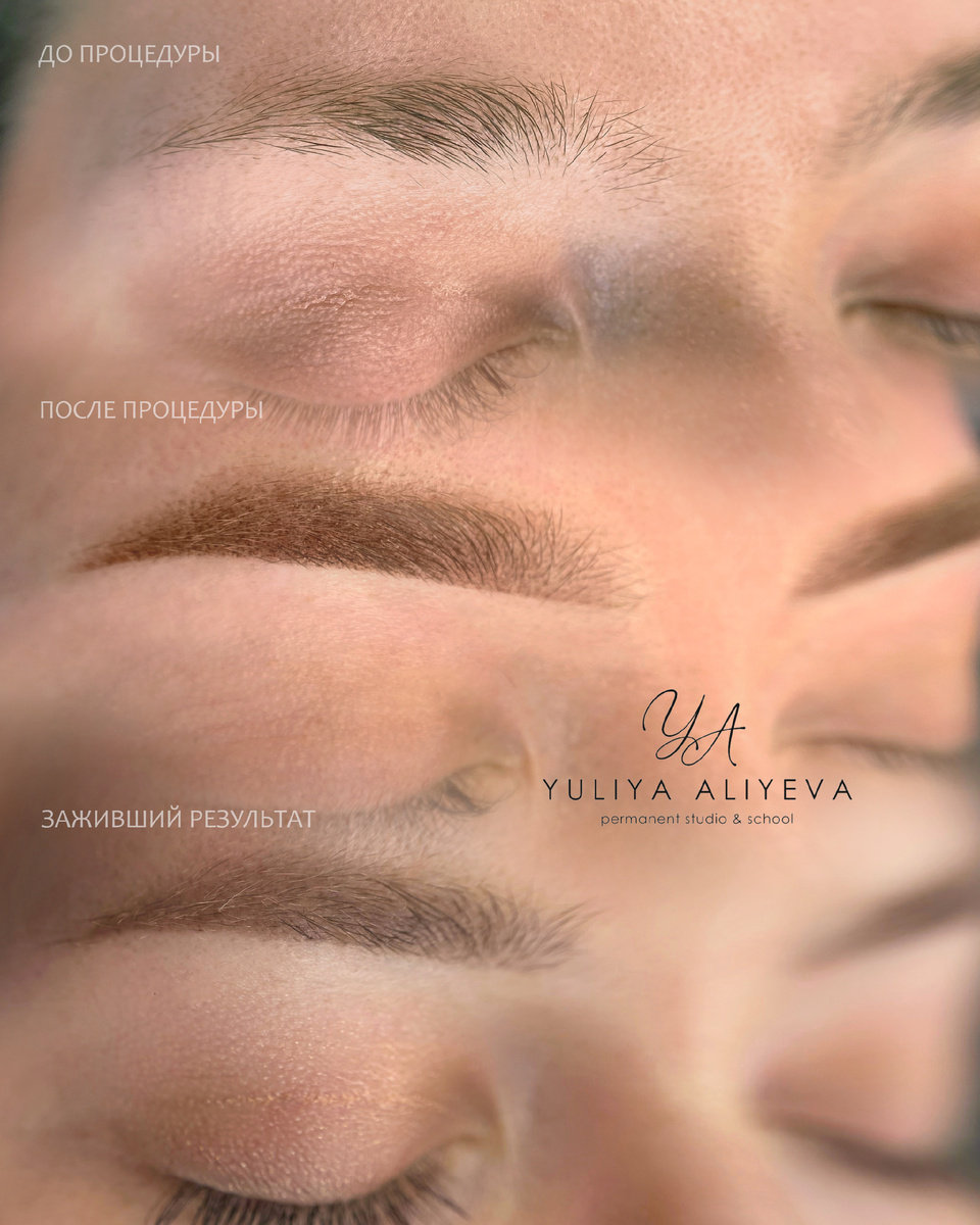Перманентный макияж бровей в технике Airy Brows, до, результат сразу после процедуры и заживший результат после 1 процедуры