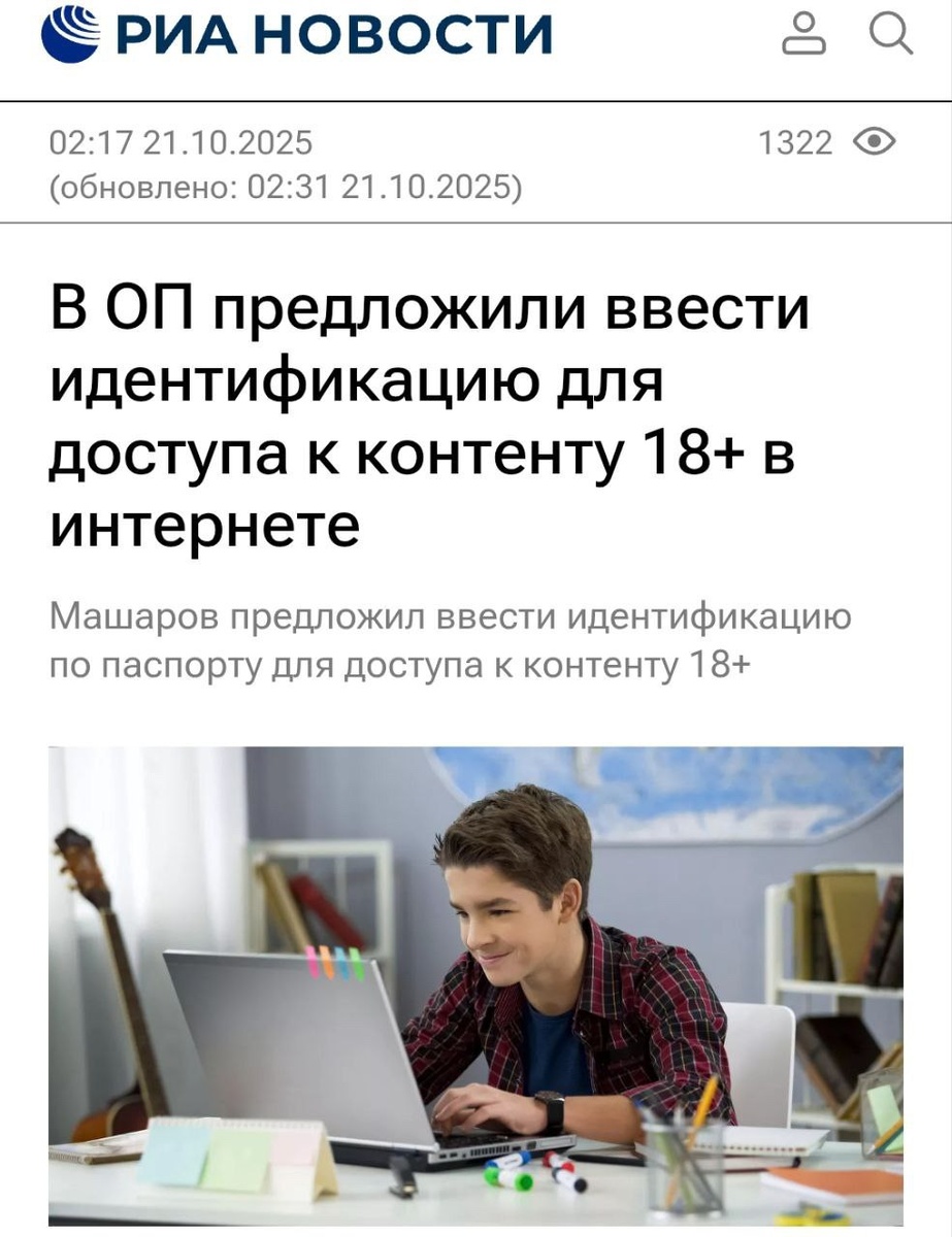 В Общественной палате РФ предложили россиянам подтверждать возраст для доступа к 18+ контенту, поскольку «видеоролики с нецензурной бранью, насилием и пропагандой девиантного поведения формируют у молодёжи неправильные модели поведения, а также размывают моральные ценности».