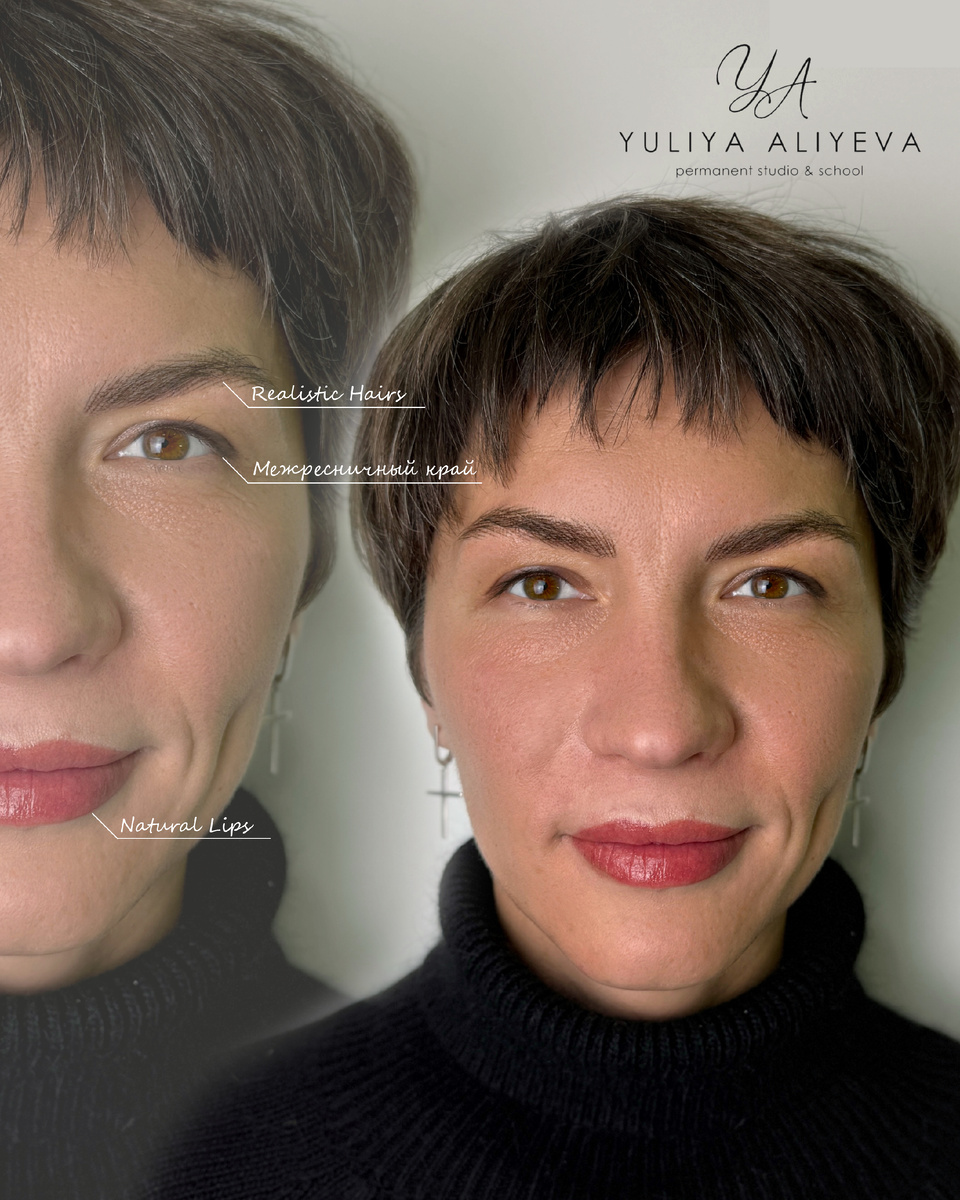 Перманентный макияж бровей в технике Realistic Hairs, губ в технике Natural Lips, век в технике Межресничный край, до и результат сразу после процедуры