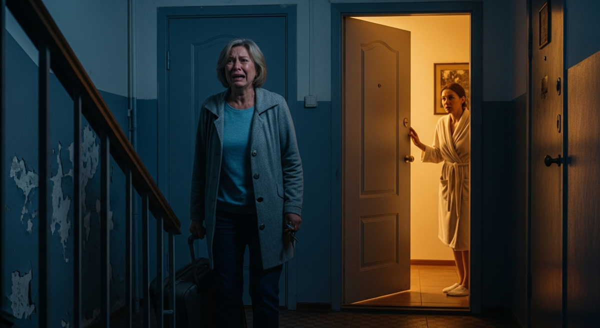 Она стояла на лестничной клетке со своим чемоданом, как нищенка. Без дома, без ключей, без прошлого. Она достала телефон и дрожащими пальцами набрала номер сына.