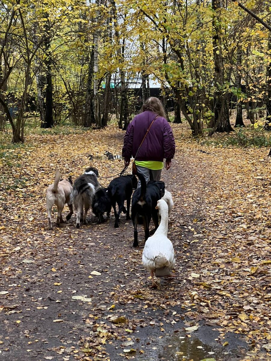 Осенние зарисовки в одном из парков Москвы. 👉🏾 Диалог с хозяйкой живности: - Это все ваши? - Мои. - И даже гусь? - Какой гусь? - Ну вот этот белый большой гусь, он тоже ваш? - Это Мартин. Никогда не знаешь, в какой сказке очутишься, просто выйдя из дома. ☝🏽Заметьте, Мартин гуляет со специальным мешочком, чтобы не загрязнять все вокруг себя.