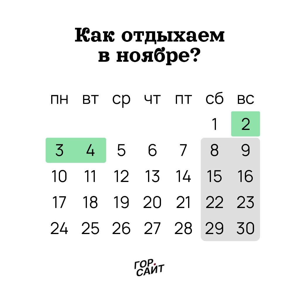 Шестидневка будет на следующей неделе в преддверии праздников Шестидневная рабочая неделя продлится с 27 октября по 1 ноября. Зато затем нас ждут три выходных дня со 2 по 4 ноября. В этот период выходной день перенесли с субботы, 1 ноября, на понедельник, 3 ноября, чтобы создать непрерывный период отдыха для празднования Дня народного единства, который приходится на 4 ноября. Для тех, кто привык к пятидневке, суббота, 1 ноября, станет полноценным рабочим днём, который необходимо будет отработать. При этом конкретное время начала и окончания работы в этот день нужно будет согласовать с работодателем. Для тех, кто и так трудится шесть дней в неделю, 1 ноября останется обычной рабочей субботой, но рабочий день будет сокращён на один час.