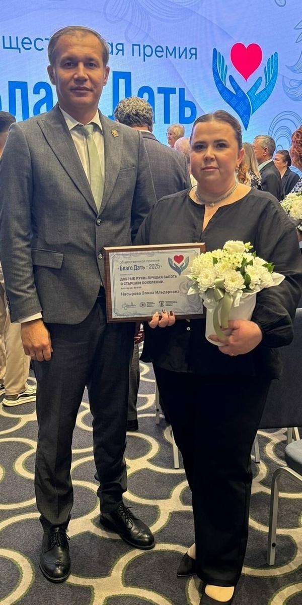 Эта победа подтверждает высочайший уровень квалификации медицинского персонала учреждения и служит примером заботы и внимания к пациентам старшего возраста. Врач-терапевт Центральной Языковской Центральной районной больницы Элина Ильдаровна Насырова успешно выступила в региональной номинации «Добрые руки: лучшая забота о старших», продемонстрировав высокое профессиональное мастерство и искреннюю приверженность своей профессии. Эта победа подтверждает высочайший уровень квалификации медицинского персонала учреждения и служит примером заботы и внимания к пациентам старшего возраста. Искренне поздравляем Элину с достижением и желаем дальнейших успехов в благородном труде врача! На фотографии запечатлен радостный момент вручения награды Элине Ильдаровне вместе с главным врачом Языковской ЦРБ Алмазом Азатовичем Загидуллиным. источник: Языковская ЦРБ