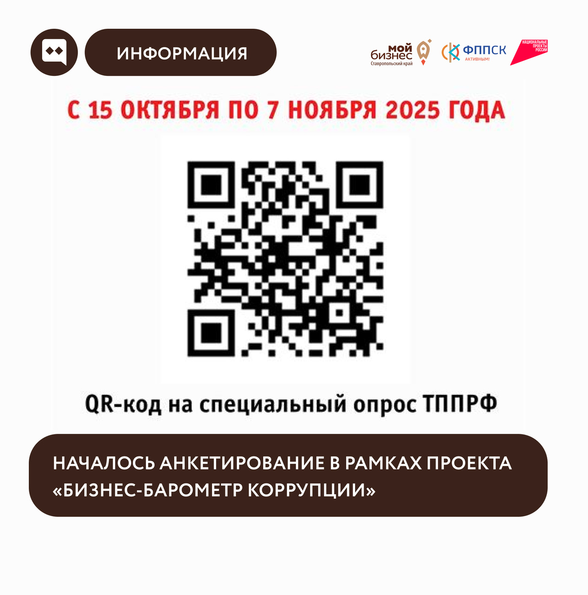 Фонд поддержки предпринимательства Ставропольского края информирует о старте XIII этапа Всероссийского проекта Торгово-промышленной палаты Российской Федерации «Бизнес-Барометр Коррупции». Исследование проводится с 15 октября по 7 ноября 2025 года и направлено на измерение антикоррупционных настроений и оценку эффективности антикоррупционной политики в России. Особое внимание в этом году уделено изучению причин коррупционных проявлений, их влияния на экономику страны, а также анализу факторов, способствующих снижению коррупциогенности «теневой экономики». Принять участие в анкетировании могут представители делового сообщества — владельцы бизнеса, индивидуальные предприниматели, самозанятые граждане, сотрудники инфраструктур поддержки предпринимательства и институтов развития, а также представители органов власти. Результаты исследования будут учтены при совершенствовании государственных антикоррупционных программ. Анкетирование проводится анонимно. Сроки проведения: с 15 октября по 7 н
