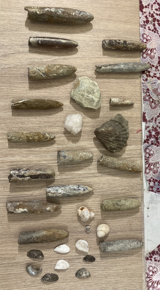 Сейчас собрано небольшое количество остатков раковин или ростров моллюсков белемнитов 🐌 прямиком из мезозойской эры (юрский и меловой периоды) примерно им возраст 65 миллионов лет найдены на территории Саратова; так же есть камень с отпечатком растения 🌱, тоже скорее всего очень древнего; отпечаток раковины найден в Крыму; остальные ракушки привезены с берегов Черного моря (Сочи)