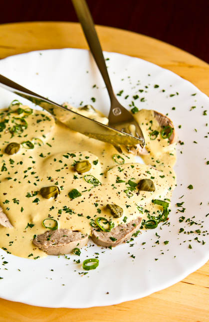 5. После приготовления майонеза добавьте консервированного тунца, анчоусы, половину каперсов, несколько ложек бульона от варки мяса и тщательно измельчите блендером.
