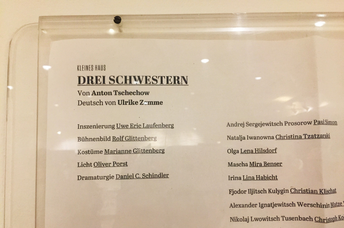 Сразу скажу, что, в отличие от многих других культурных мероприятий в Германии, которые мне довелось посетить за последние три с половиной года, эта постановка "Трёх сестёр" Чехова в Государственном Гессинском театре в Висбадене, к счастью, не продвигала политические воззрения нынешних правящих кругов. Слава Богу! "Drei Schwestern" (нем.) - "Три сестры" Второй плюс: в общем и целом представление было выдержано в стиле сответствующей эпохи. Текст практически соответствовал оригиналу (хоть и звучал, разумеется, на немецком). Актёры играли хорошо. Да и театр этот впечатляет замысловатостью убранства - люстрами, лепниной, скульптурами и прочими украшениями. Словом, всем тем, что создает торжественную, праздничную атмосферу и позволяет гостям почувствовть себя по-особому, как будто в каком-то ином, полусказочном мире. Хотя "Три сестры" ставили в довольно скромном зале в так называемом Kleines Haus*. Малое здание - нем. Всё равно обстановка была соответствующей, приподнято-театральной. Предп
