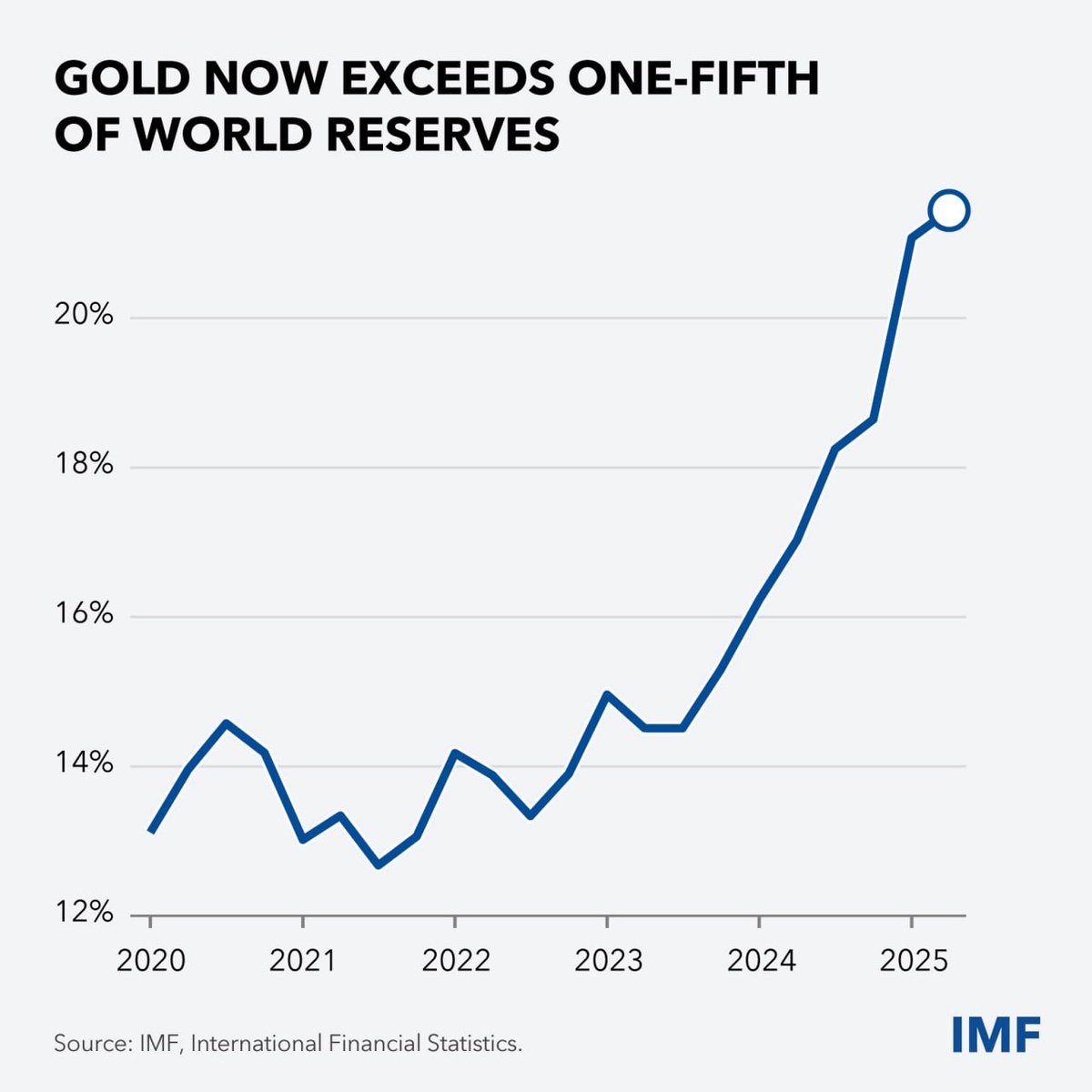 🌕 МВФ: ЗАПАСЫ МОНЕТАРНОГО ЗОЛОТА У МИРОВЫХ ЦБ В НАСТОЯЩЕЕ ВРЕМЯ ПРЕВЫШАЮТ ОДНУ ПЯТУЮ МИРОВЫХ ОФИЦИАЛЬНЫХ РЕЗЕРВОВ