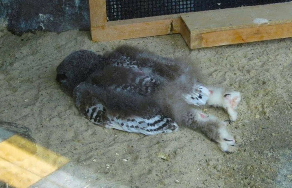 Да, вы не ослышались. Совята спят именно так - распластавшись на животе, потому что их голова слишком тяжелая для хрупкой шейки. Выглядит это одновременно умилительно и немного жутковато - как будто птенцы просто упали и не могут встать.