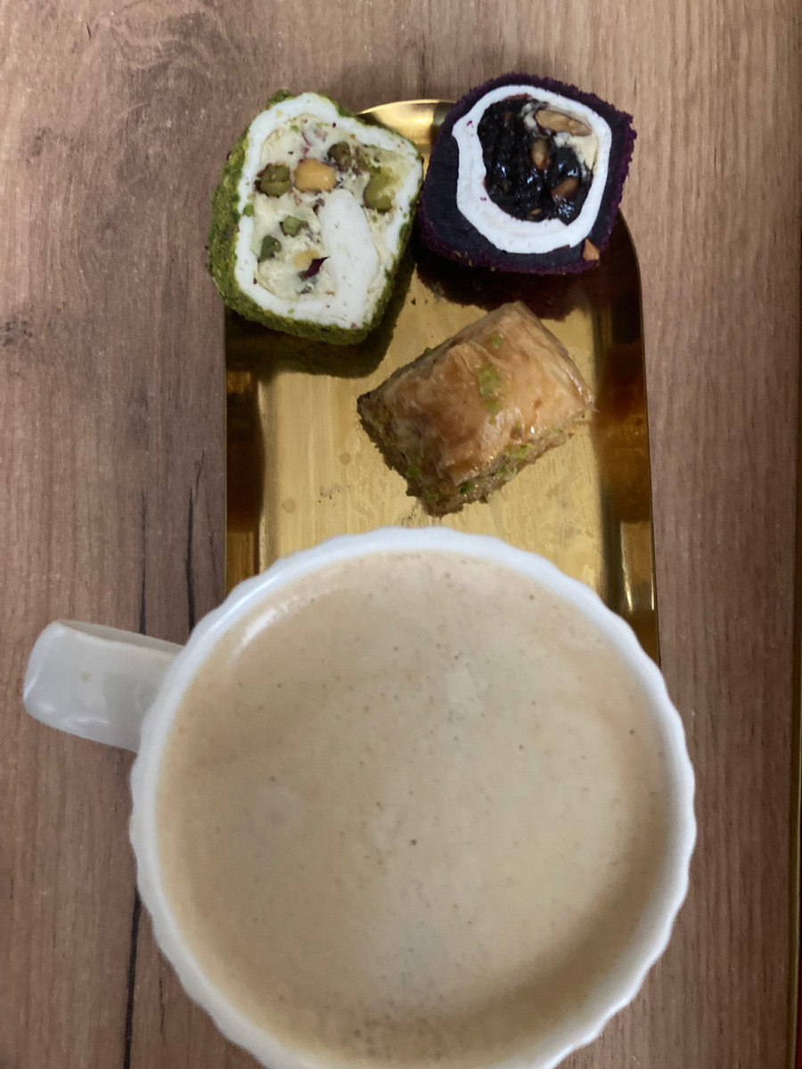 Всем хорошего настроения и прекрасного дня! У меня утро начинается с вкусностей. Открыли вкусняшки из Турции. Очень вкусные и свежие . Пошла в Ашан,вроде мне ничего не надо. Очень конфет захотелось хороших. Купила форель. Свеклу. Истратила 3018 рублей. Ну вы же понимаете что мне ничего не надо. Тут меня в магазине поймал муж. Приехал за мной. Пока его ждала заказала чай. Я не ожидала что за 69 рублей я получу такой классный чай,прям зимний.Я еще ухитрилась взять с собой стаканчик и дома залила кипятком,потому что там бадьян он должен завариваться. Ужин с мужем.