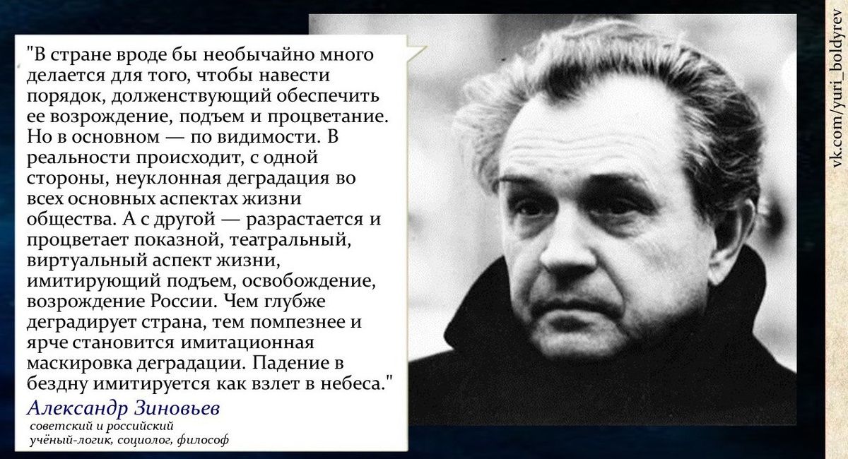 Александр Зиновьев - может быть, последний великий русский философ, скончавшийся еще в 2006 году. Человек, вышедший из народных глубин, и, как Ломоносов столетиями раньше, самостоятельно достигший интеллектуальных вершин. Его у нас любят порою цитировать, но мало кто досконально изучает, а надо бы. Особенно - для понимания исторических процессов, происходящих уже после его ухода - которые он предвидел лучше Нострадамуса, потому что Нострадамус напускал тумана, а Зиновьев, наоборот, подсвечивал процессы, происходящие с мировой цивилизацией вообще и отдельно взятой Россией в частности. Да так, чтобы не получалось двойных или тройных толкований - он, конечно, лишил этим куска хлеба различных толкователей, но поступал как честный человек - "Человек всегда остается один, если вздумает стать человеком" (с) Что это я о нем вдруг решила вам напомнить? А вдогонку к предыдущей публикации о душечке Донни и вообще о происходящем в мире и ожидающем наше и идущие наа смену поколения, нравится это, и