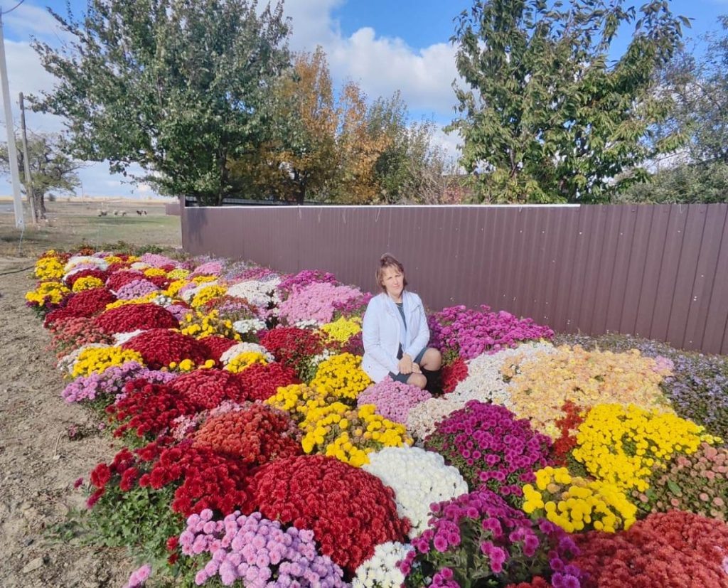 Разведением цветов занимается Светлана Подкатилова Цветоводы называют хризантему «королевой осени» не зря – она восхищает разнообразием форм и расцветок. Любителей этого цветка много, а профессиональные цветоводы даже устраивают фестивали хризантем. Например, в Никитском ботаническом саду в Крыму бал хризантем проходит каждый год, в этом году он начнется буквально на днях – 23 октября. Зрителям представят почти 500 сортов этого цветка! Не планируете на выходные в Крым, не беда. Наши хозяйки от профессионалов не отстают. Каждую осень мы видим хризантемы на клумбах у частных дворов на улицах поселков и хуторов нашего района. В последние годы очень популярны низкорослые шаровидные мультифлоры, но и бабушкины сентябринки не сдают позиции. Вот такое разноцветье осенних хризантем мы встретили на въезде в хутор Гусев. Настоящий ковер из цветов, мимо которого не проедешь. Мы и не проехали, познакомились с хозяйкой этой красоты. Светлана Подкатилова работает в администрации поселения, а цветы –