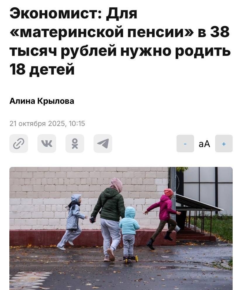 Россиянкам нужно родить 18 детей для «материнской пенсии» в ₽38 тыс., подсчитали экономисты. «Эксперты» уверяют, что «накопить детьми» достойную пенсию гораздо быстрее, чем сидеть на официальной зарплате десятки лет.