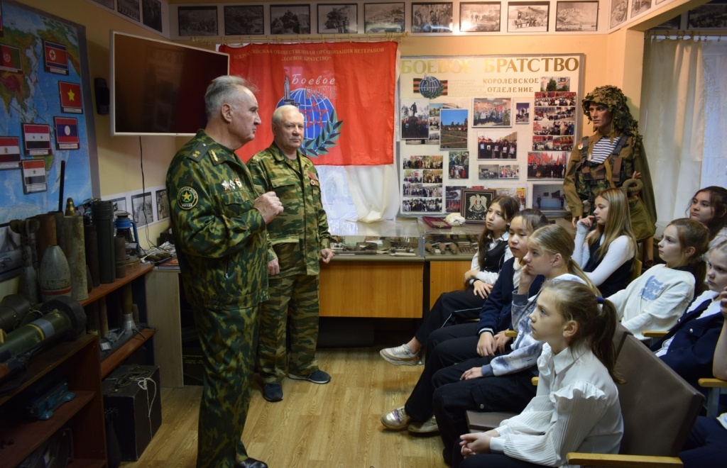 21.10.2025г. в музее отделения общероссийской организации «Боевое братство» в городе Королеве состоялся «Урок мужества», для группы учеников лицея № 4, который подготовили и провели руководитель отделения организации «Боевое братство» тов. Смородин Сергей Николаевич и руководитель молодежной патриотической организации Колесниченко Екатерина Сергеевна. Перед школьниками выступил участник боевых действий в Афганистане и на Северном Кавказе, ветеран военной разведки и контрразведки, советник генерального директора КТРВ генерал-лейтенант Бугреев Владимир Иванович, рассказавший о героизме воинов СССР и РФ в боях по защите нашей Родины. Мероприятие открыл председатель Королевского городского отделения Всероссийской организации «Боевое Братство» участник боев в Афганистане тов. Смородин С.Н. Школьники с интересом слушали рассказы ветеранов. Генерал –лейтенант Бугреев В.И. вручил активистам молодежной организации Почетную грамоту и сувениры от воинов Специальной военной операции на Украине