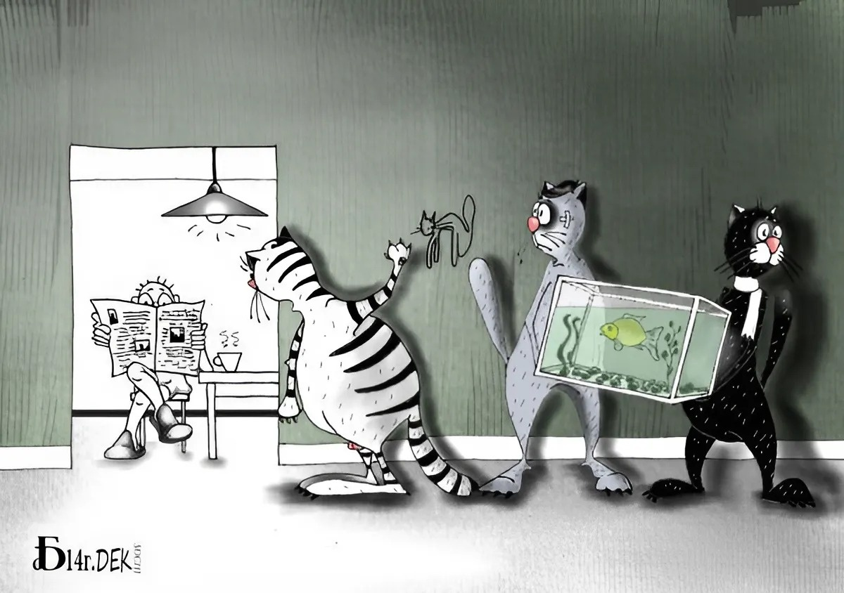 Наш кот Марсик устроил настоящий скандал. Всё началось с того, что он перестал пускать меня в спальню. Сидит на пороге, шипит, хвост трубой. Жена только улыбается: «Это тебе за твои ночные загулы!» А я всего лишь раз в неделю хожу с друзьями в баню. Возвращаюсь поздно, но всегда трезвый. Но Марсик явно принял сторону жены. Теперь он демонстративно спит только на её подушке, а мою игнорирует. Вчера поймал его на воровстве — тащил мой носок под диван, видимо, в знак протеста. Ветеринар сказал, что коты чувствуют напряжение в семье. Пришлось срочно налаживать отношения. Купил жене цветы, а Марсику — дорогой корм. Теперь кот позволяет мне гладить свой живот, но требует дополнительную порцию перед сном. Хитрый вымогатель! Зато жена снова смеётся, а носки остаются на месте.