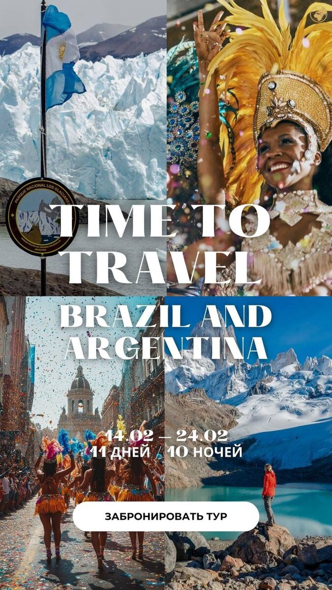 Приглашаем вас в грандиозное путешествие по Южной Америке! 🇧🇷 Откройте для себя волшебство двух континентов! Вместе с гарантированным туром - «БРАЗИЛИЯ И АРГЕНТИНА: КАРНАВАЛ, ВОДОПАДЫ, СТЕЙКИ, ГОРЫ И ЛЕДНИКИ»💃 Невероятное приключение ждёт тех, кто мечтает погрузиться в атмосферу латиноамериканской страсти, увидеть величественные природные чудеса и прикоснуться к самому яркому шоу на планете – Бразильскому карнавалу! Что вас ждет в этом необычном путешествии? 🕺Карнавал в Рио-де-Жанейро – самое зрелищное событие планеты! Море блёсток, огненная самба и улицы, пульсирующие в ритме барабанов. Станьте частью этого грандиозного шоу! 🗽Статуя Христа-Искупителя – величественный символ Рио на вершине горы Корковадо. 📸Сделайте незабываемые фото с распростёртыми руками Спасителя. 💦Водопады Игуасу – грандиозный комплекс из 275 водопадов на границе Бразилии и Аргентины. Мощь и величие природы, от которых захватывает дух! 💃Буэнос-Айрес – элегантная столица танго и жареного мяса. Прочувств