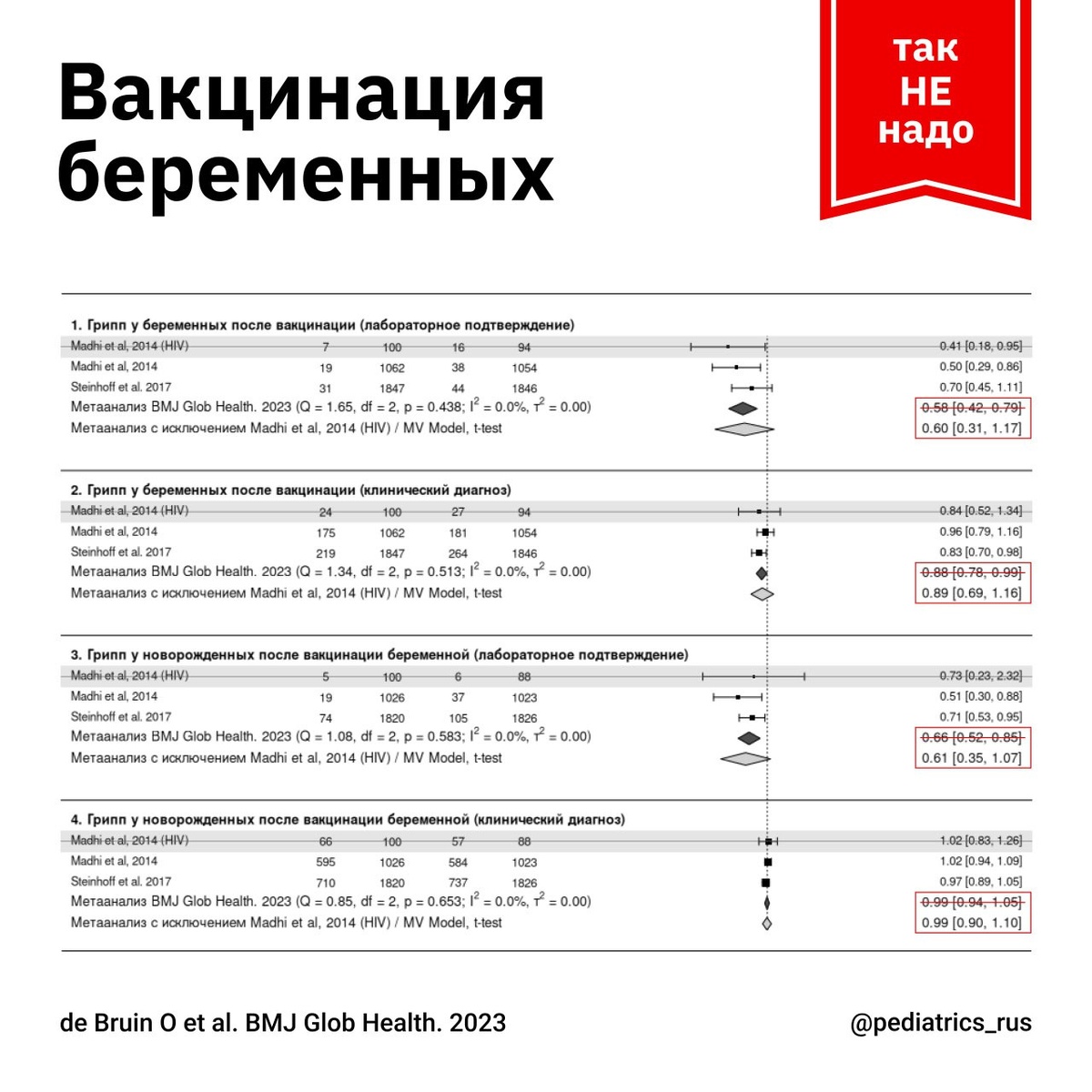 Вакцинация беременных против респираторных инфекций. Осень в разгаре, и многие эксперты опять говорят о необходимости вакцинации будущих мам от гриппа, ковида, респираторно-синцитиальной вирусной инфекции (РСВИ) и коклюша, делая особый акцент на слабости иммунитета беременных и новорожденных и необходимости защиты столь уязвимых пациентов. Однако эффективны ли эти прививки? Помогут ли они пациентам — мамам и новорожденным — избежать заболевания? Обратимся к одному из недавних систематических обзоров, опубликованному в BMJ. doi.org/10.1136/bmjgh-2023-012376 1. Вакцинация от гриппа. В тексте обзора указано, что в результате поиска в нескольких медицинских базах данных найдено три рандомизированных исследования. При анализе данных этих исследований определено, что прививка способна защитить от заболевания гриппом и будущую маму, и ее ребенка. Однако в расчетах допущена ошибка: в анализ данных включено неподходящее исследование. Оказывается, что вместе с данными здоровых женщин были про
