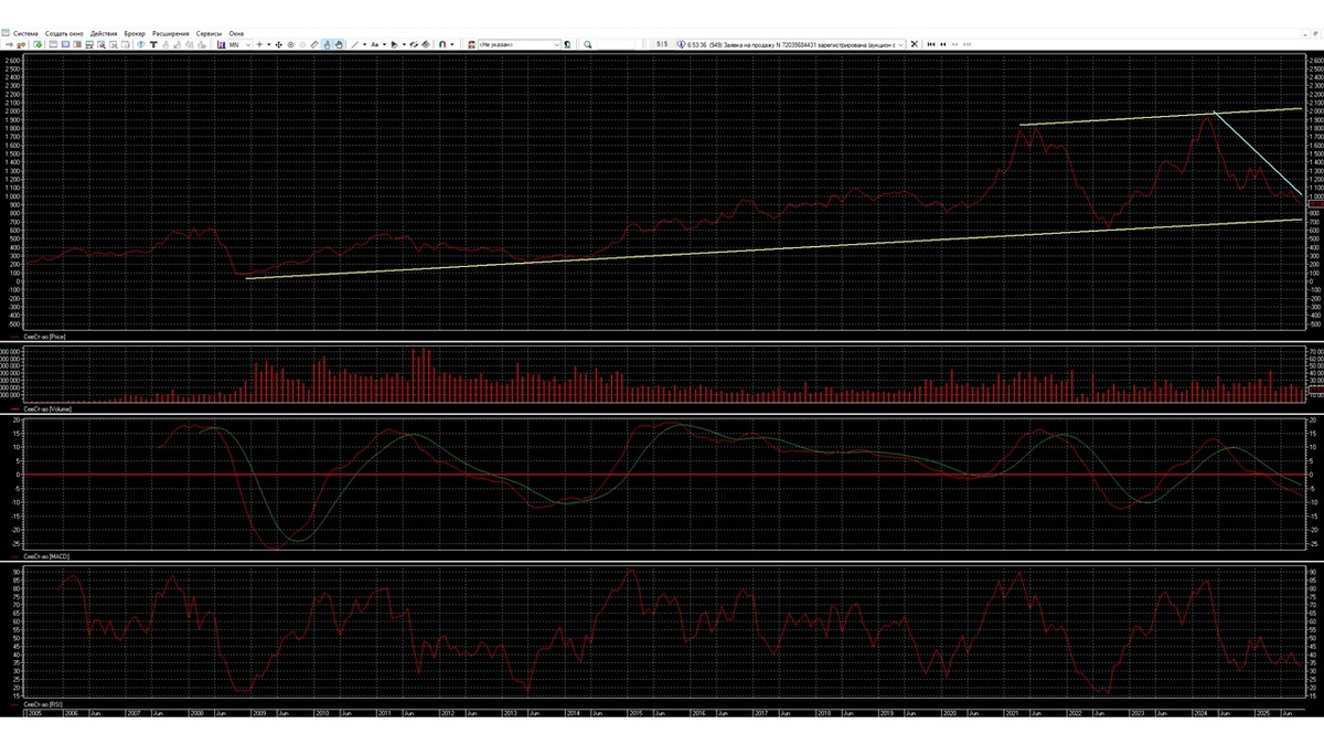 2. Новостной фон постепенно ухудшается, рубль находится в коридоре 80-85, спрос на металл продолжает медленно понижаться. Центральный банк РФ понизил ставку на 1% или отказался понижать ставку до января 2026 года. Компания Северсталь сообщает инвесторам о затруднительном положении компании по росту прибыли, это связано с падением спроса на металл. В конце октября акция располагается под уровнем 900, но не стремится резко двигаться к линии поддержки тренда. К середине ноября подошла к уровню 850, к концу ноября остановила свое движение на уровне 850 с попыткой перейти в боковое движение или развернуться наверх. К середине декабря быки продолжают удерживать уровень 850, даже иногда удается приблизить акцию к уровню 900, позже она откатывается к уровню 850.