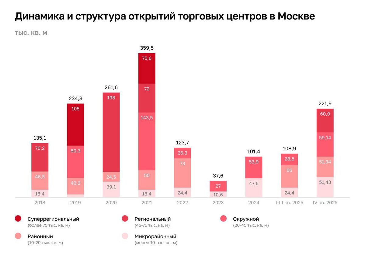 По данным NF Group, рынок торговой недвижимости Москвы демонстрирует активный рост. Основные показатели: Планируемый ввод торговых центров в 2025 году — 330 тыс. кв. м, что превышает суммарный показатель за последние три года С начала 2025 года уже введено 109 тыс. кв. м в 10 торговых центрах Показатель 2024 года — 101,4 тыс. кв. м До конца года ожидается открытие 15 новых объектов общей площадью около 200 тыс. кв. м Уровень вакантности в ключевых ТЦ Москвы по итогам III квартала 2025 года — 5,2% Ключевые объекты, планируемые к открытию в 2025 году: Avenue Sever — 60 тыс. кв. м «Краски» — 35 тыс. кв. м Объекты, перенесённые на 2026 год: МФК «Алхимово» — 7,2 тыс. кв. м МФЦ «Остафьево» — 9 тыс. кв. м ТЦ West Mall — 15,8 тыс. кв. м ТЦ Portal — 15 тыс. кв. м ТЦ «Летний сад» — 20,5 тыс. кв. м МФК Lakes — 24,1 тыс. кв. м 👉Следите за новостями на нашем канале: @Commers_Estate ✔️Реализуйте свою недвижимость тут: @Commers_Estate_ads #аналитика #тц