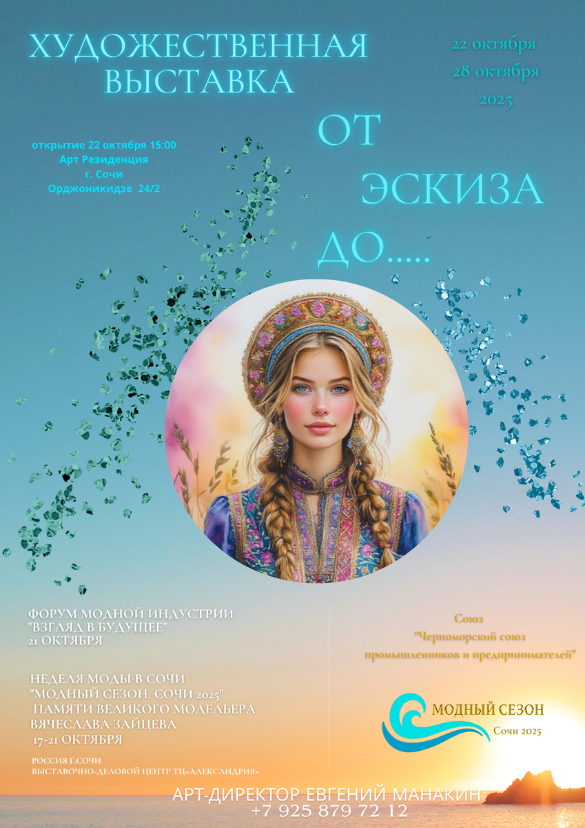 Художественная выставка Посвященная памяти великого модельера Славы Зайцева " От эскиза до... " Арт директор Евгений Манакин В рамках форума модной индустрии "Взгляд в будущее" Официальная Неделя моды в Сочи " Модный сезон. Сочи 2025" Директор Ольга Самсонова Генеральный информационный партнер ТАСС ИА РОСМЕДИА Генеральный партнер Арт резиденция Сочи Выставка открылась 22 октября 2025г. г. Сочи ул. Орджоникидзе 24/2 Арт Резиденция Благодарим художников принявших участие: Сергей Груков Дина Лебедева Ольга Фирсова Елена Косик Розелина Спасенова Груков Сергей Яковлевич Текстильный институт им.Косыгина. Факультет Прикладного Искусства Сотрудничество С американскими студиями текстильного дизайна. Заместитель начальника художественной мастерской ООО«Трехгорная мануфактура» Обязанности и достижения: Создание эскизов рисунка тканей, контроль подготовки рисунка к выпуску, контроль технологии создания рисунка, участие в подготовке и оформлении выставок различного уровня, участие в различных