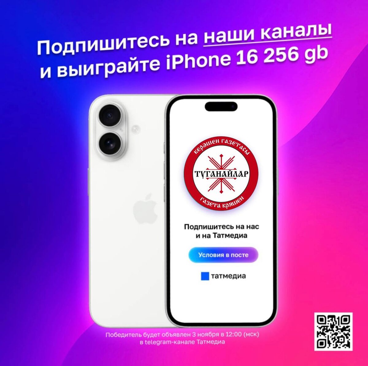🎁📱Татмедиа белән бергә iPhone 16 256GB уйнатабыз Шартлар: 1. Безнең каналга язылыгыз Туганайлар - газета кряшен 2. MAXта Татмедиага язылыгыз 3. TGда Татмедиага язылыгыз һәм «участвую» төймәсенә басыгыз Нәтиҗәләр - 3 ноябрьдә 12:00 сәгатьтә Татмедиа TG-каналында