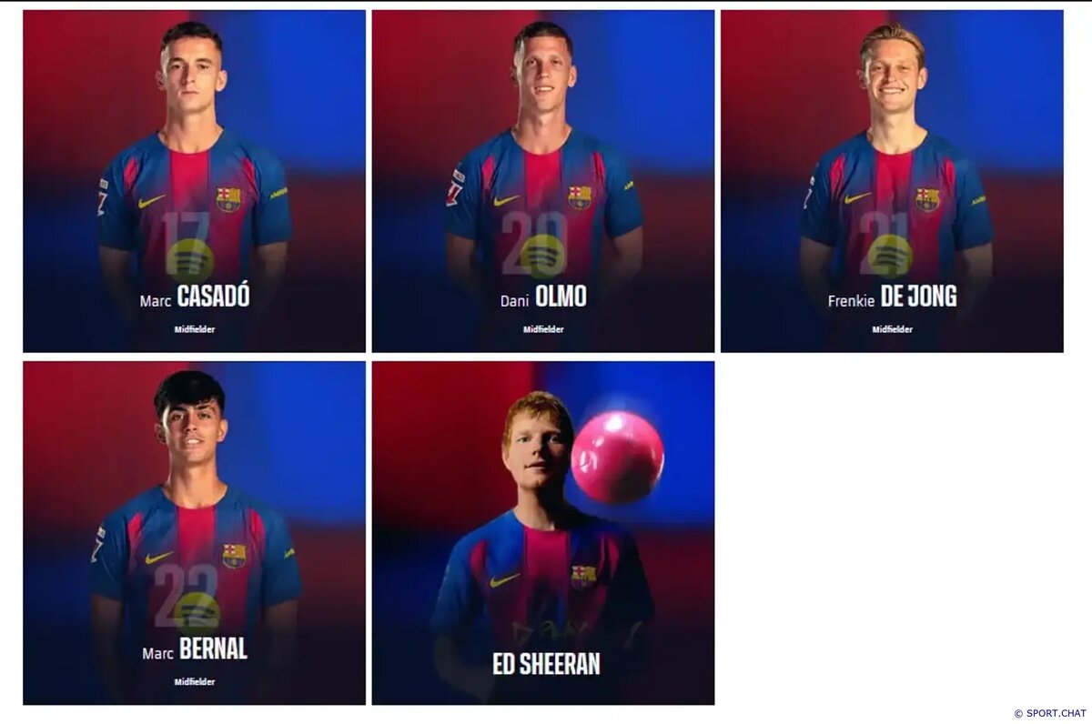 Британский певец значится в составе команды вместе с Педри, Гави, Де Йонгом и другими полузащитниками, а рядом с его именем — клубное фото и фирменный красный мяч.