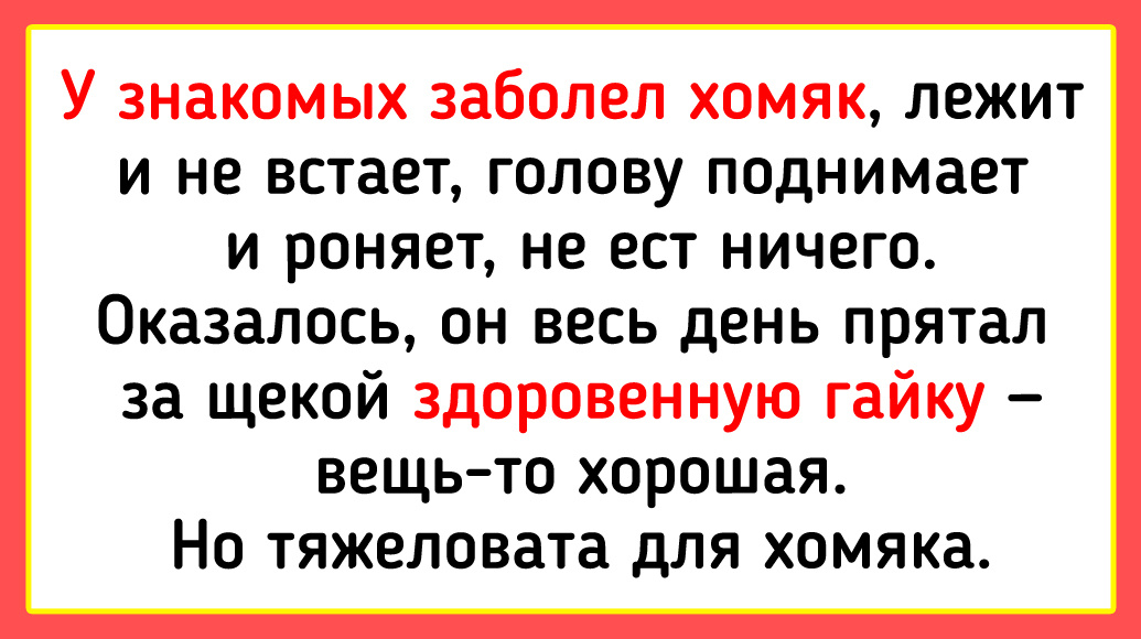 - У знакомых заболел хомяк, лежит и не встает, голову поднимает и роняет, не ест ничего. Оказалось, он весь день прятал за щекой здоровенную гайку — вещь-то хорошая. Но тяжеловата для хомяка. © dyadka1337 / Pikabu