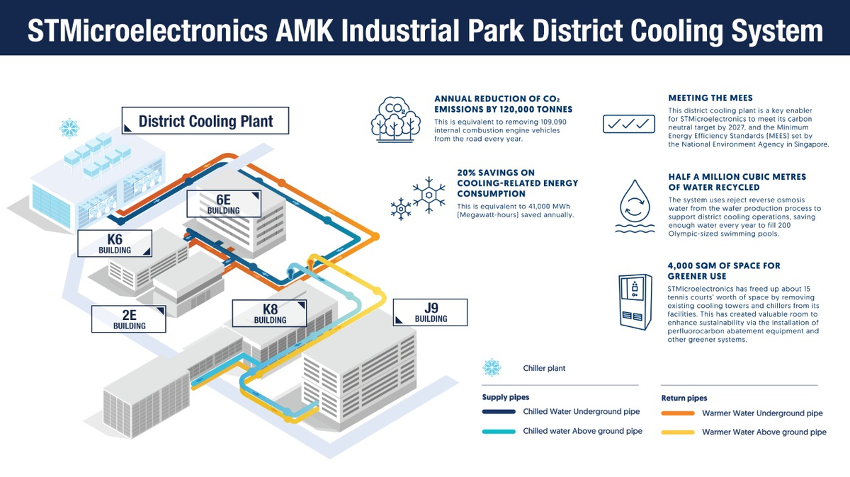 STMicroelectronics и SP Group ввели в эксплуатацию крупнейшую в Сингапуре промышленную систему централизованного охлаждения на территории Ang Mo Kio TechnoPark, что стало важным шагом в стратегии декарбонизации ST. Система спроектирована, построена, принадлежит и управляется совместным предприятием SP Group и Daikin Airconditioning (Singapore) и призвана сократить ежегодные выбросы углерода ST до 120 000 тонн. Новая система также позволит снизить расходы на электроэнергию для охлаждения на 20% и повторно использовать более 500 000 кубометров воды, прошедшей обратный осмос, которая ранее применялась в градирнях. Система охватывает площадь около 90 000 квадратных метров и заменяет отдельные охладители на централизованную замкнутую сеть, подающую охлажденную воду в производственные и офисные здания. Подробнее на нашем сайте