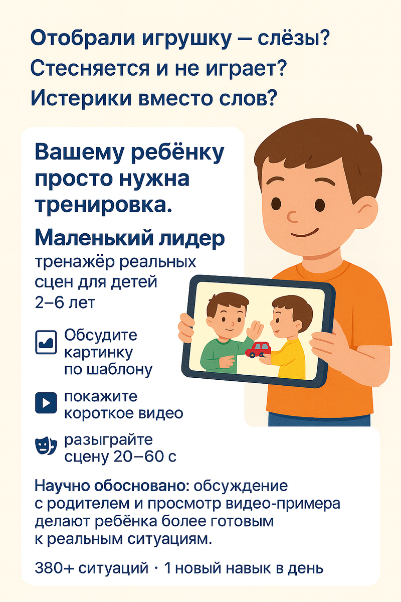 Бэкстейдж проекта: зачем мы это делаем, на чём основана методика, как устроены тренировки и что выйдет в релиз. Мы начали «Брайтот» с простой цели: снизить стресс в обычных детских ситуациях и дать родителю понятные шаги. За каждым сценарием — реальные просьбы семей и проверенная методика: обсудили картинку → посмотрели короткое видео → отрепетировали 60 секунд. Детям сложно удерживать внимание, когда экран «шумит». Мы отказались от баннеров и всплывающих окон — интерфейс минималистичен, чтобы ничто не конкурировало с вашей беседой. В релизе — 300+ тренировок на каждый частый случай 2–6 лет: площадка, садик, врач, дом, магазин, транспорт. Дальше добавим новые пакеты по запросам семей. Собираем обратную связь в закрытой бете (100 семей). Хотите попасть? Напишите «Хочу в бета» в наши сообщения или оставьте контакт в форме (ссылка в профиле).