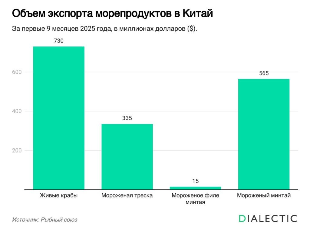 Российские компании за январь–сентябрь 2025 года экспортировала в Китай рыбу и морепродукты на $2,2 млрд, что на 13% больше, чем годом ранее. Об этом сообщает Рыбный союз. Объем экспорта рыбы и морепродуктов из России в Китай за девять месяцев 2025 года составил 800 тыс. тонн, что на 3% меньше, чем в 2024 году. Основной прирост в денежном выражении обеспечили мороженый минтай (435 тыс. тонн, +5%; $565 млн, +40%) и мороженая треска (60 тыс. тонн, -15%; $335 млн, +25%). Поставки мороженого филе минтая сократились до 7 тыс. тонн (-60%) и $15 млн (-50%), а живых крабов выросли до 27 тыс. тонн (+15%) при $730 млн (-5%). Рост цен на минтай и треску стал ключевым фактором увеличения выручки. В первом квартале 2025 года экспорт достиг $680 млн (+2%), несмотря на снижение объема до 275 тыс. тонн (-5%). Среди лидеров: минтай (170 тыс. тонн, -5%; $215 млн, +30%), сурими (10 тыс. тонн, +10%; $22 млн, +20%), треска (16 тыс. тонн, -10%; $80 млн, +30%) и пикша (5 тыс. тонн, +300%; $22 млн, +600%). По